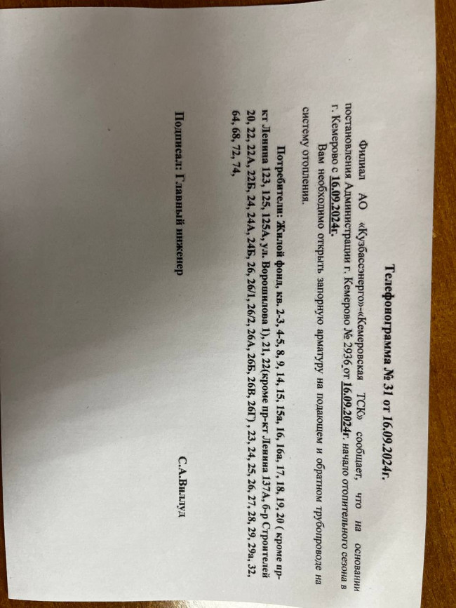 Начало отопительного сезона в г. Кемерово с 16.09.2024г.